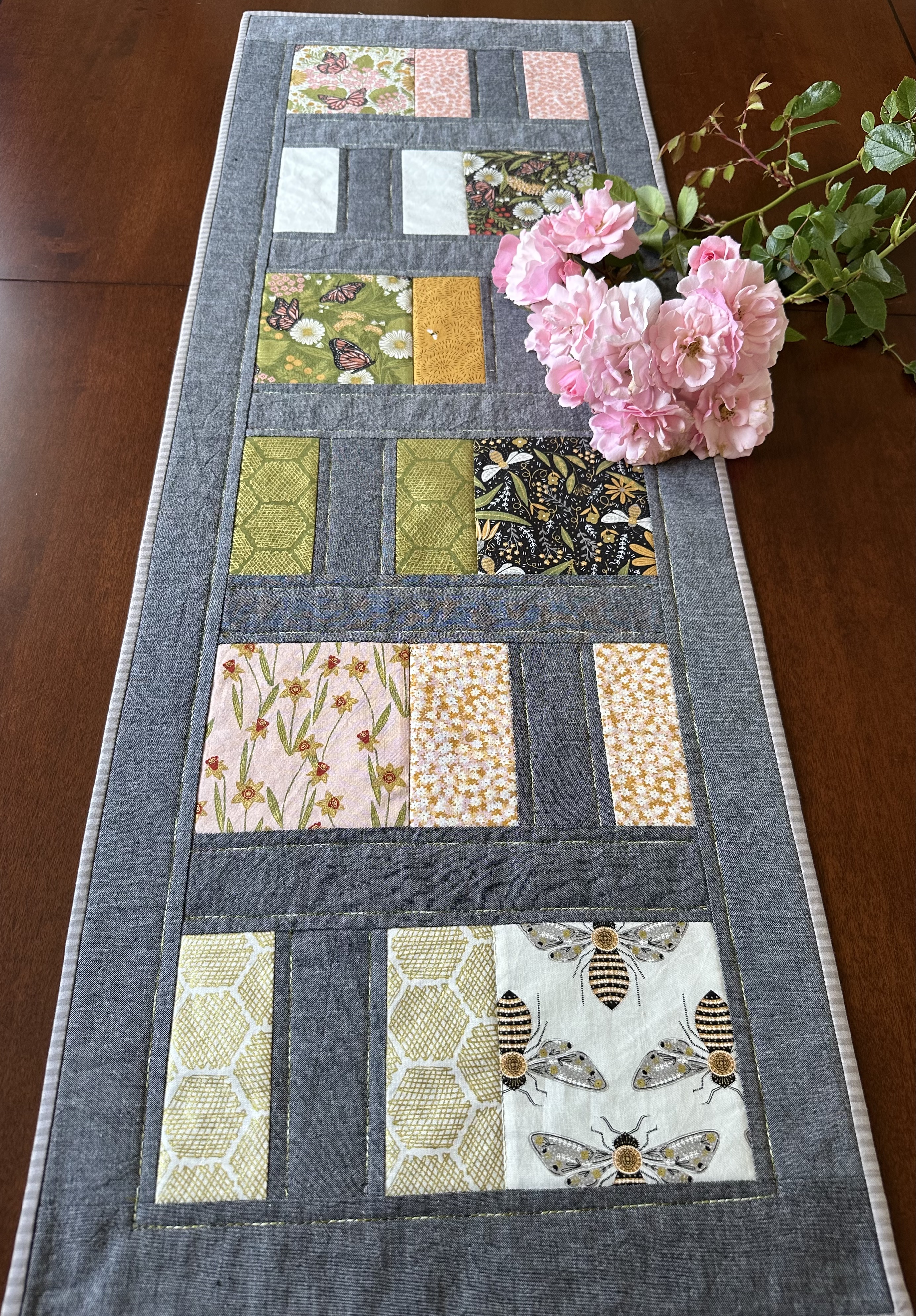 Løperen designa eg frå ein Charm Pack “Bee Garden” eg kjøpte hos Lappeteknikk.no Løparen har eg gitt navnet “Vårens eventyr”