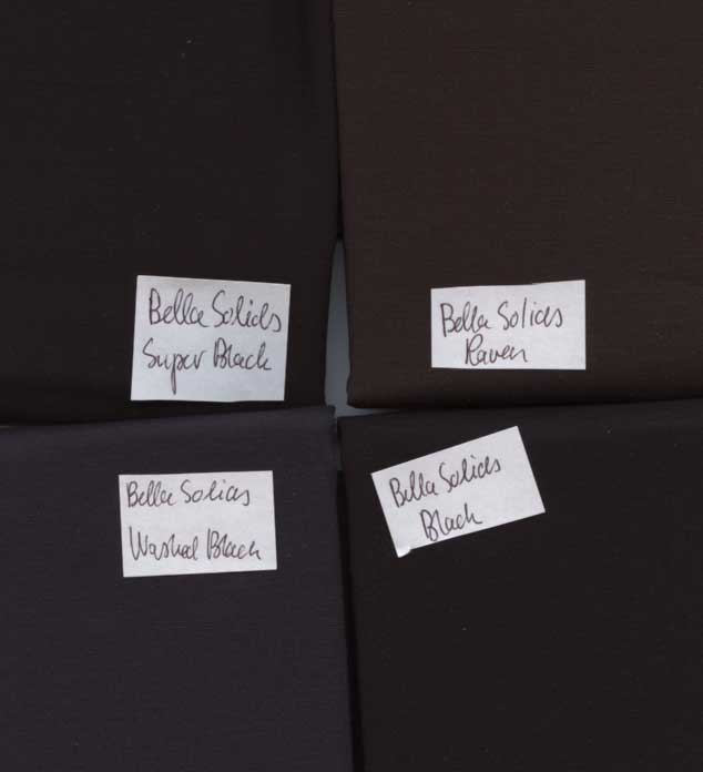 Eit flott einsfarga stoff fra Moda. Klikk under bildet for å så dei fire “svarte” i dag. Du vil sjå at Super Black er det svartaste, Black er god svart, Washed Black har mykje blått i seg og Raven har mykje brunt i seg.