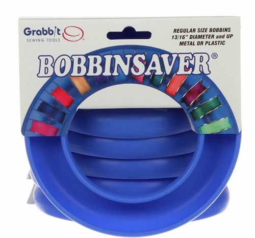 • BobbinSaver™ spoleholder holder metall- eller plastspoler i alle størrelser! Formet som en halv bagel og uthulet, er den laget av fleksibel gummiaktig plast som utvider seg for å ta imot spolen og raskt fester seg rundt den. Trådene vil ikke floke seg eller rulle seg ut. BobbinSaver™ holder over 20 spoler sikkert. BobbinSaver™ er en enkel og elegant dings for å oppbevare alle typer spoler. Enheten måler 3/4 tommer i høyden og 5-1/8 tommer i diameter. — Spoler ikke inkludert.