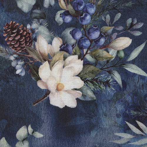 Et herlig stoff med blåbær blomster og kongler.