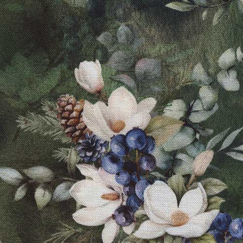 Et herlig stoff med blåbær blomster og kongler. Klikk under bildet for å sjå det i større utsnitt, men da i blått.