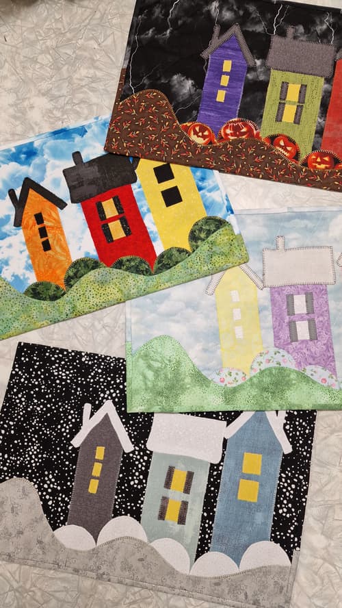 Et herlig mønster på frokosbrikker der du bruker applikasjon. Klikk under bildet så ser du originalbildet fra AnnAKa. De fire brikkene er sydd av Ann Kristin Leirdal.