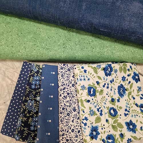 Ein herlig pakke med fem mønstrete stoff og to basis.