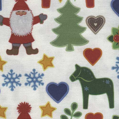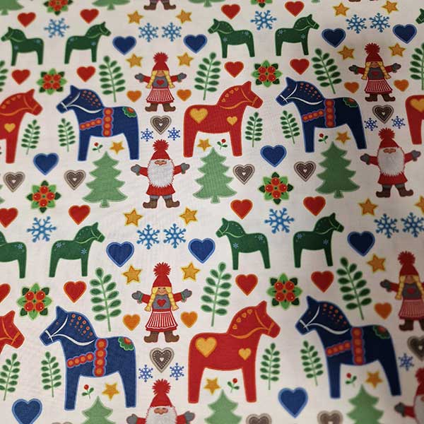 Et herlig stoff med dalahester til jul. Klikk under bildet for å sjå eit større utsnitt.