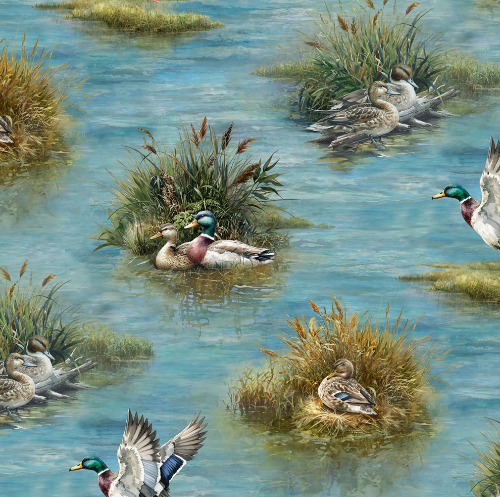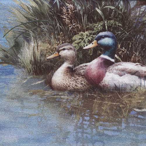 Nydelig stoff med ender som både ligger og begynner å fly. Klikk under bildet for å sjå eit større utsnitt. Stoffet er ikkje turkis som det store utsnittet.