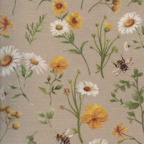 Et nydelig stoff med gule og hvite bomster. Små bier også.