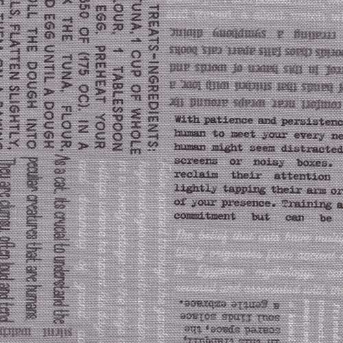 Dette stoffet har et herlig design med lilla kattetematekst på en grå bakgrunn, noe som skaper en finurlig og leken estetikk som er perfekt for ulike syprosjekter. Teksten er arrangert i et repeterende mønster, noe som gir en munter og engasjerende visuell appell. Stoffets unike design er ideelt for både håndverksentusiaster og profesjonelle designere, og gir et snev av moro til enhver kreasjon.