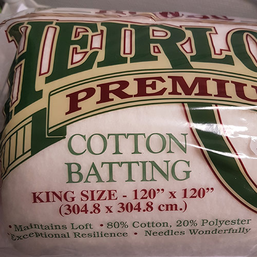 Flott vatt som består av 80% bomull og 20% polyester. Den måler 304 ganger 304 cm. Syr du tepper som måler 150 ganger 150 cm har du til fire tepper. Kan krympe opptil 5% om den blir brukt uten å bli vaska først. Ikkje bruk vaskemiddel om du vel å vaske den før bruk. Kun bløte i lunka vatn i 10 min. Sentrifuger lett og tørk på luft i tørketrommel. Quiltes med ca 10 cm mellomrom.
