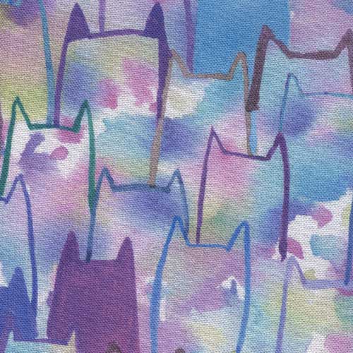 Et herlig stoff med katter i lilla og blå toner.