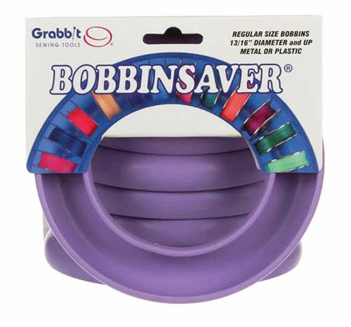 BobbinSaver™ spoleholder holder metall- eller plastspoler i alle størrelser! Formet som en halv bagel og uthulet, er den laget av fleksibel gummiaktig plast som utvider seg for å ta imot spolen og raskt fester seg rundt den. Trådene vil ikke floke seg eller rulle seg ut. BobbinSaver™ holder over 20 spoler sikkert. BobbinSaver™ er en enkel og elegant dings for å oppbevare alle typer spoler. Enheten måler 3/4 tommer i høyden og 5-1/8 tommer i diameter.