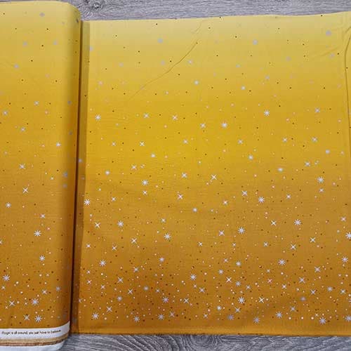 Eit lekkert stoff som er gradert fra mørk gul til lys gul med stillige sølvstjerner.