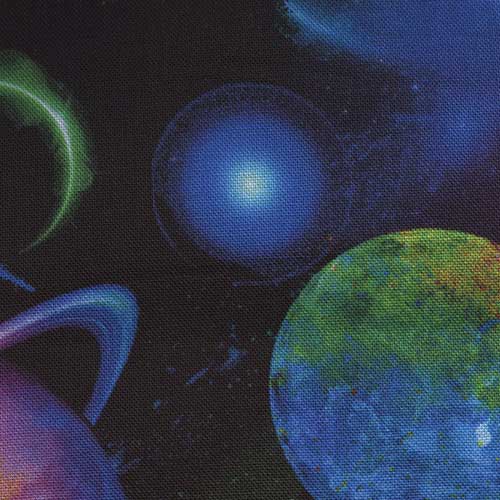 Et spennande stoff med fargerike planetar. Klikk under bildet for eit større utsnitt. Farganeer dusare enn i bildet på utsnittet.