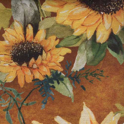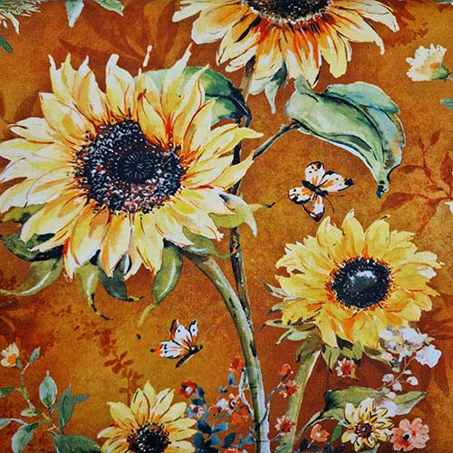 Et nydelig stoff med store lekre solsikker. Klikk under bildet for å så eit utsnitt som måler 20*20 cm. Rapporten er 65 cm.
