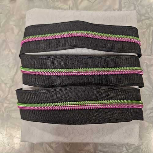 Svart glidelås i metervis med grønne og rosa tenner #5