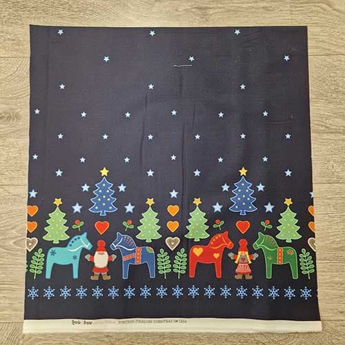 Et herlig panel der du får to slike sider. De svenske dalahestene og søte nisser. Flott utgangspunkt for julekalender eller gardinkapper. Du får også stoff til fire spisebrikker. Da tar du blå og lyseblå hest sammen og rød og grønn hest sammen. Der er fire slike tilsammen.