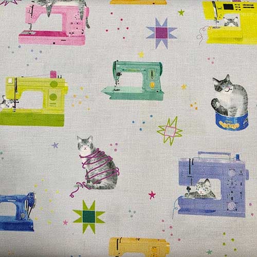 Dette sjarmerande stoffet er fullt av fargerike symaskiner, små kattar og leikne detaljer – perfekt for deg som elsker å sy 💕