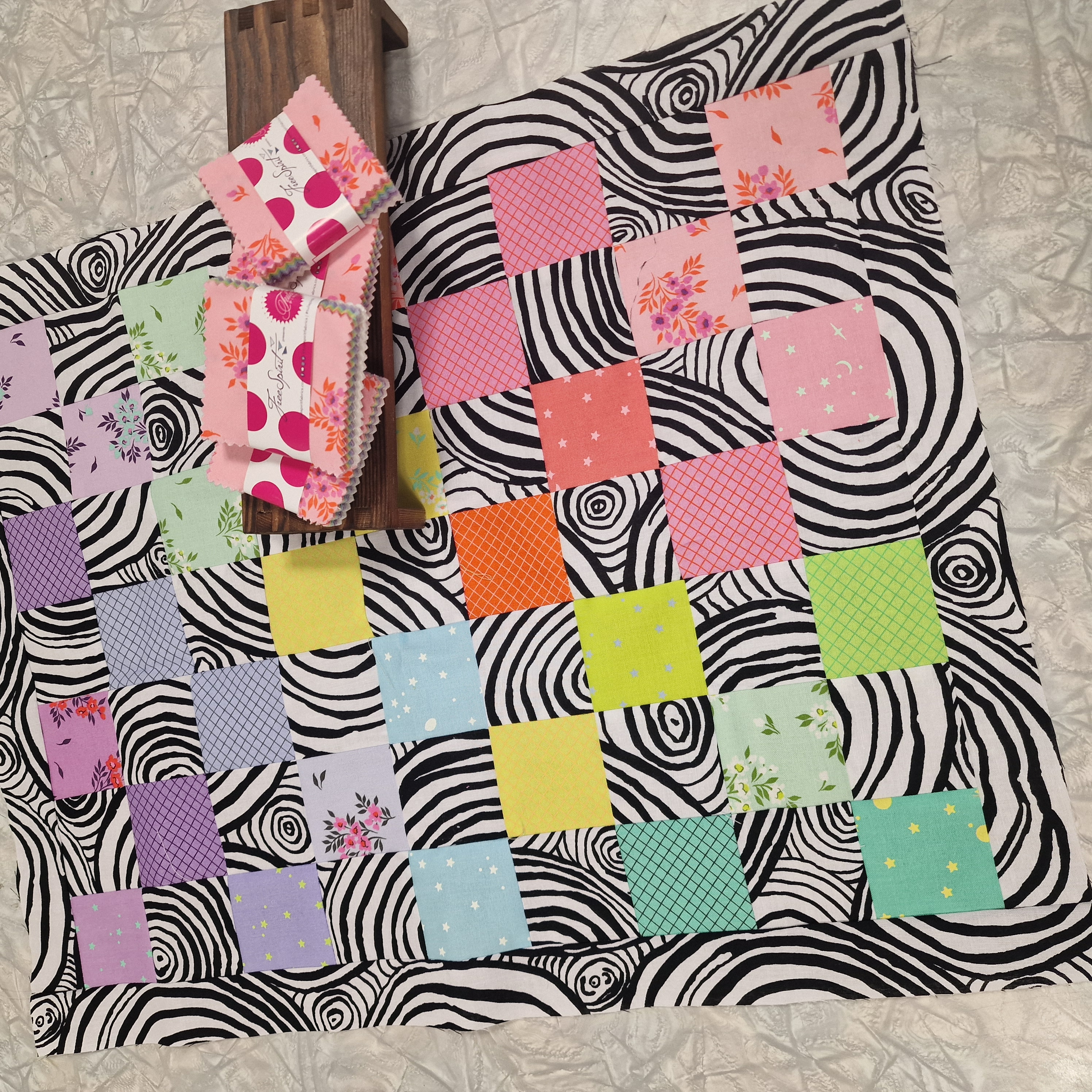 Ein herlig pakke med kvadrater. Klikk under bildet så ser du ser du kva eg sydde med mini-charmsene. Det svart kvite stoffet er ikkje med i pakken.