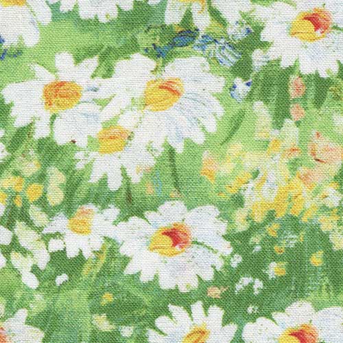 Et herlig stoff med frisk grønn farge og tusenfryd utover.